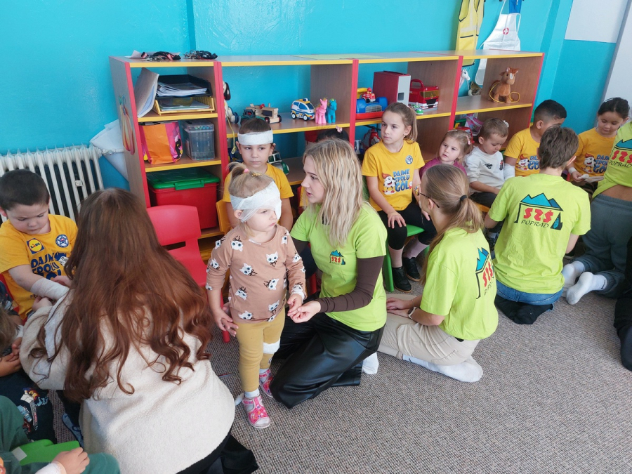 V utorok dopoludnia (18.11.2025) sme navštívili MŠ Veľký Slavkov. Prostredníctvom hry sme deti naučili základy prvej pomoci: ako efektívne privolať pomoc, ako správne ošetriť časté poranenia (ako sú odreniny, popáleniny a zlomeniny) a prečo sú kľúčové protišokové opatrenia.